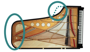 We are manufacturing our concert grand E, in a new, slightly modified form: the frame was lengthened by approx. 3.5 cm (1 1/2"), the resonance space for the bass will enlarged without the strings being lengthened. The concert grand is now always equipped with a sordino (alternating with the sostenuto pedal) and the Mozart Rail.